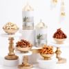 A graceful blend of tradition and indulgence, this Diwali hamper is designed to leave a lasting impression. Presented in an elegant German silver-plated basket, it features two beautifully crafted ivory palace-view canisters, an assortment of gourmet nuts including peri-peri almonds and Thai chilli cashews, classic Kaju Katli, and a symbolic Charan Paduka. Decorative lotus Shubh Labh hangings and metal flower-shaped diyas add a divine touch, making this hamper perfect for festive gifting.