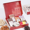 Pamper your brother with this indulgent Bhai Dooj hamper. Arranged in a red tray, this hamper includes an assortment of roasted and salted almonds and cashews, Velvety Bar Roast Almond chocolate and Velvety Bar Mixed Berries chocolate, a silver polished puja thali, decorated coconut kalash, along with roli-chawal. Give your celebrations a sweet and savoury twist with this hamper packed with nuts and treats. You can place the puja thali in your puja room after the festivities. Give your sibling a delectable surprise with this hamper.