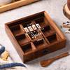 A masala box is the pride of every kitchen. Add some stylish spice to your life with this exclusive square wooden masala box. It has nine individual wooden square bowls and a wooden spoon. The clear acrylic lid with a spicy message can be personalized with your name.