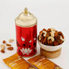 Celebrate Diwali like never before with this hamper, designed to bring joy and warmth to the festivities. Packaged in an eco-friendly box, this hamper includes metal diyas, Besan Laddoo, Kaju Katli, a dry fruit mix, and a canister. The exquisite flavours of Besan Laddoo and Kaju Katli sweeten the celebrations and bring home the essence of Diwali. Delight taste buds with the crunchy Dry Fruits Mix. The canister features beautiful patterns and can be reused after the festivities. Personalize it with your brand logo to make it a special Diwali gift.