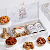 Add a touch of luxury and festive charm to Diwali with this carefully crafted hamper. It features two elegant Metal Diyas, bringing a warm and inviting glow to any space. Savoury delights like Peri Peri Almonds, Thai Chilli Cashewnuts, and Caramel Almonds offer the perfect crunch, while Lebanese Baklava Sweets add a rich, indulgent flavour. The luxurious Marble Majesty Canisters are perfect for storing treats, and the hamper is beautifully presented in a Marble Majesty Lacquered Box, making it a perfect gift for loved ones.