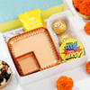 Gift your brother a memorable Bhai Dooj with this Sweetness And Tradition Hamper. The dry fruit mix brings a healthy and flavorful crunch, while the indulgent besan laddoo adds a touch of sweetness to the occasion. A beautifully crafted square metal plate serves as the centrepiece for the ritual, along with traditional roli chawal for the perfect pooja ceremony. A charming fridge magnet adds a delightful keepsake, making this hamper both festive and functional. Thoughtfully designed, it is the perfect way to share love and blessings this Bhai Dooj.