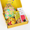 A healthy treat for your sibling. Beautifully presented in a Yellow Eco-friendly box, this hamper includes a Dry Fruits Mix, which is a delightful blend of premium nuts and dried fruits. Indulge in the rich and luscious flavours of Velvety Bar Roast Almond and Velvety Bar Mixed Berries, perfect for sweet moments. The stunning yellow lotus design potli and gold-polished puja thali, complete with roli-chawal, add a traditional touch to your festivities. This Bhai Dooj, show your affection with this heartwarming hamper.