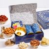 Indulge in the art of festive gifting with this opulent hamper, designed to leave a lasting impression. Presented in a magnificent blue and white box with a golden ribbon, it includes two ornate canisters with golden lids and tassels. The hamper features a box of delicious Soan Papdi by Masqa, a classic festive treat. The elegant design and premium sweets make this an exquisite gift, embodying the spirit of traditional celebrations. It's a truly memorable way to send your warm wishes.