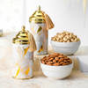 Timeless gifting calls for a touch of elegance and grandeur. This Ramadan hamper is crafted to leave a lasting impression, beautifully presented in a beige leather wooden tray. Adorned with flowing tassels, pampas grass, copper-sprayed dried peonies, gold-sprayed leather ferns, and a striking gold motif, it exudes festive sophistication. Inside, gourmet delights await, peri peri almonds and salted cashews packed in canisters. Thoughtfully designed to reflect both luxury and tradition, this hamper is more than a gift it is a statement of love, care, and celebration that they will truly cherish.