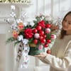 Wrapped in Christmas cheer, this vibrant arrangement gathers the seasons most joyful elements. Bold red roses and sprayed red gypso burst from lush cypress and delicate ming fern, while dried cotton blooms add soft, snowy whimsy. Playful gingerbread accents peek through the greens, paired with a cascade of matte, glitter, and candy-striped baubles in classic holiday reds and whites. Finished with a burlap snowman ribbon and presented in a striking round green box, it captures the sweetness, sparkle, and childlike wonder of Christmas, making it a perfect centerpiece to brighten every holiday moment. Product Dimensions: H - 20 inches x W - 24 inches