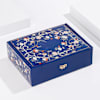 Celebrate Diwali with a gift that beautifully blends tradition and indulgence. This hamper features a Golden Square Rangoli with Jewels to bring festive elegance, MASQA Classic Milk Velvety Chocolate for a sweet touch, and a rich assortment of Salted & Roasted Almonds, Roasted Cashews, and Kaju Katli for timeless delight. A greeting card and a Tea Light Candle add the spirit of Diwali, all presented in a Blue Lacquered Flora Box that exudes sophistication. Perfect for employees, clients, and business partners, this hamper is designed to spread festive cheer and lasting goodwill.