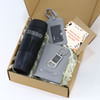 A handy kit for your dad who loves travelling. This hamper includes a black steel tumbler, a grey passport cover with a luggage tag, a keychain, and a lovely greeting card featuring a customized message. The black steel mug features the word Hero, which he can use to carry his favourite beverage without any hassle. The passport cover will keep his passport, documents, cards, and currency safe. Personalize the cover with your father's name while the keychain with his initial and make sure he travels in style.