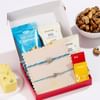 Showcase modern affection with this urban rakhi delights, a sophisticated rakhi gift set for brothers. This hamper features a set of two sleek urban designs modern rakhis, one with a lighting motif and the other with a square pearl motif. Indulge his palate with Masqa soan papdi bites, offering a unique twist on traditional sweetness. For a savoury crunch, a generous portion of premium black pepper cashews is included. This perfect rakhi with sweets combo is completed with traditional roli and chawal for the auspicious tilak ceremony, ensuring a complete and heartfelt celebration.
