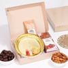Surprise your brother with this elegant Bhai Dooj gift hamper, thoughtfully packed with both taste and tradition. The hamper features crunchy salted roasted almonds and indulgent chocolate-coated almonds, creating the perfect balance of health and sweetness. To honour the ritual, it includes a gold finish puja thali paired with a glass bottle of roli chawal, completing the traditional essence of the festival. A blend of love, flavour, and festive charm, this hamper is a meaningful way to express your affection on Bhai Dooj.