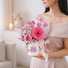 Surprise her with this charming Women's Day gift, combining a white ceramic mug adorned with the message You're Doing Great with a stunning floral arrangement, complemented by delicate heart-shaped chocolates. Wrapped in lilac tissue and finished with a pink polka dot ribbon, this thoughtful gift is sure to brighten her day. Perfect for showing appreciation, love, and admiration, it's the ideal way to express your gratitude on Women's Day. - Total No. of Stems: 3 - Deep Purple Roses, Dark Pink Gerbera - White Ceramic Mug - Heart-Shaped Chocolates - Lilac sheet & Pink Polka Dot Ribbon